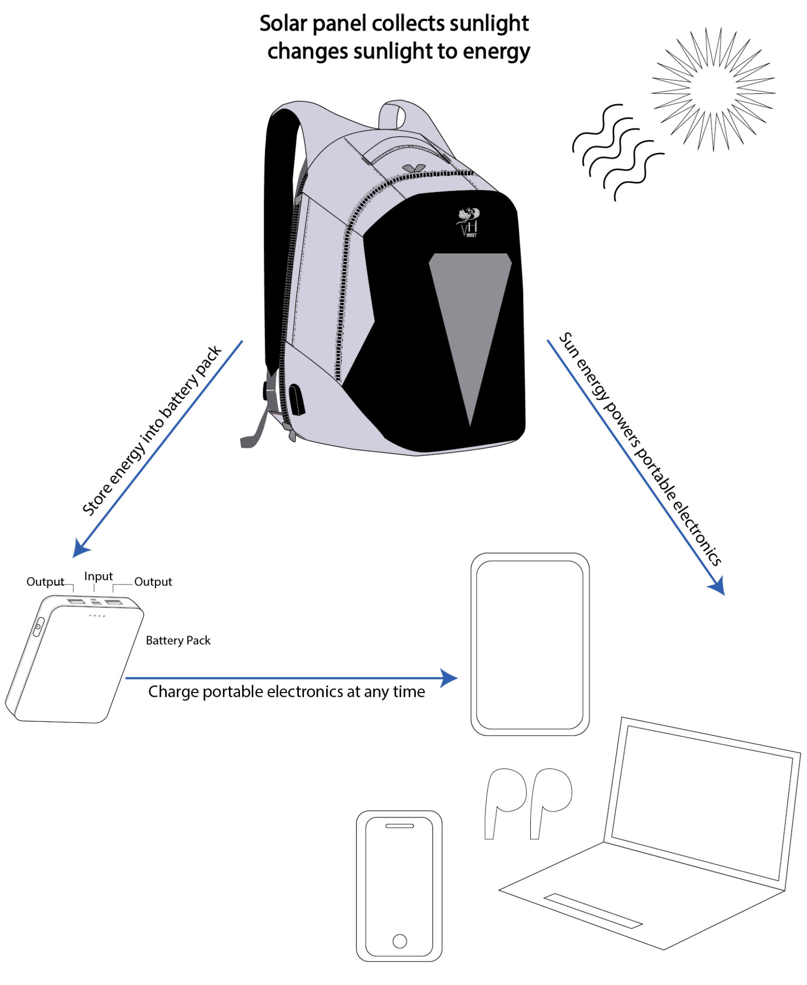 Solpack collects sunlight and changes it into energy to charge your devices day and night while you’re on the go!